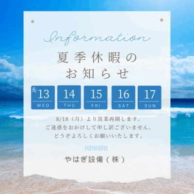 休暇 ホーム 休暇 年末年始 2025.12.26 その他 休暇 やはぎ設備にご相談ください やはぎ設備では、お客様のご家庭に合わせて、適切な対応工事を行います。 ちょっとした異変や気になる点があれば、ご相談ください。 LINEからのお問い合わせも可能です。 ご相談・お見積りはお気軽に […] 盆休みのお知らせ 2025.08.08 休暇